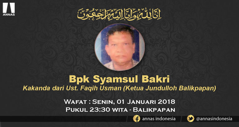 Segenap Pengurus ANNAS PUSAT mengucapkan Bela Sungkawa dan Berduka Cita yang sedalam-dalamnya atas Meninggalnya Bapak SYAMSUL BAKRI (Kakanda dari Ust. Faqih Usman (Ketua Jundulloh ANNAS Balikpapan)), Senin, 01 Januari 2018 M.