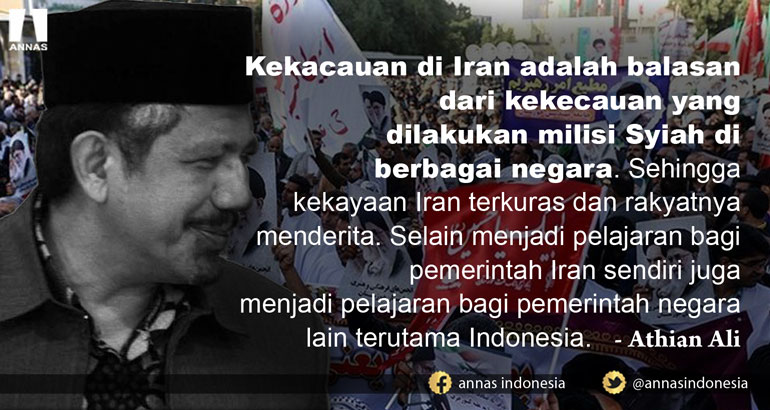 Ketua Aliansi Nasional Anti Syiah (ANNAS), KH Athian Ali mengatakan, pemerintah Iran menutupi fakta dibalik terjadinya demonstrasi rakyatnya. Pemerintah Iran justru mencoba mengalihkan isu bahkan hingga menyalahkan rakyatnya dan negara-negara lain.