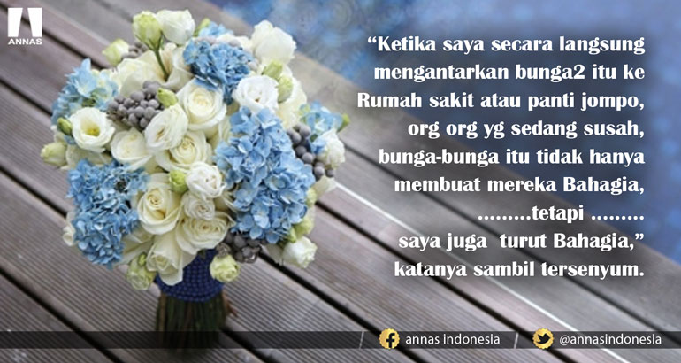 "Ketika saya secara langsung mengantarkan bunga2 itu ke Rumah sakit atau panti jompo, org org yg sedang susah, bunga-bunga itu tidak hanya membuat mereka Bahagia,