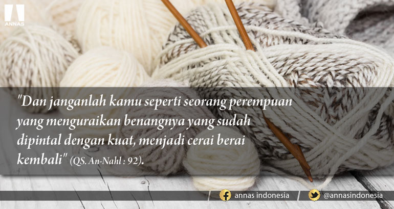 "Dan janganlah kamu seperti seorang perempuan yang menguraikan benangnya yang sudah dipintal dengan kuat, menjadi cerai berai kembali" (QS. An-Nahl : 92).