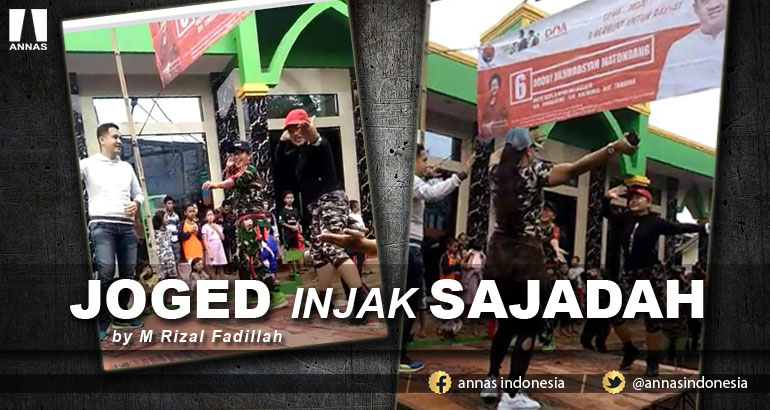 Di medsos viral tayangan di atas panggung beberapa wanita dan seorang laki laki berjoget dengan diiringi irama dangdut. Nampaknya panggung berada di dekat Mushola. Berjoged di atas alas empat buah sajadah. Berlukiskan Masjid.