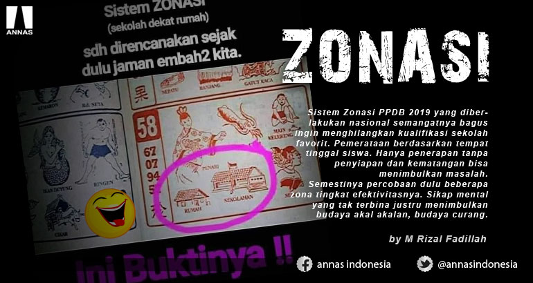 Sistem Zonasi PPDB 2019 yang diberlakukan nasional semangatnya bagus ingin menghilangkan kualifikasi sekolah favorit. Pemerataan berdasarkan tempat tinggal siswa. Hanya penerapan tanpa penyiapan dan kematangan bisa menimbulkan masalah. Semestinya percobaan dulu beberapa zona tingkat efektivitasnya. Sikap mental yang tak terbina justru menimbulkan budaya akal akalan, budaya curang. Pemalsuan alamat dengan menumpang sana sini bisa dilakukan. Seorang pejabat penganjur sistem zonasi berupaya agar anaknya tetap berada di area zona sekolah favorit dengan memindahkan alamat ke rumah dinasnya.