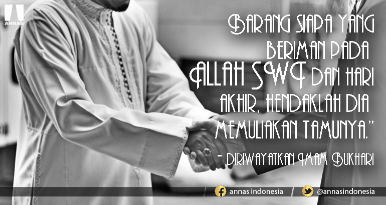 Sebagaimana sabda Rasulullah SAW yang diriwayatkan Imam Bukhari, ''Barang siapa yang beriman pada Allah SWT dan hari akhir, hendaklah dia memuliakan tamunya.”