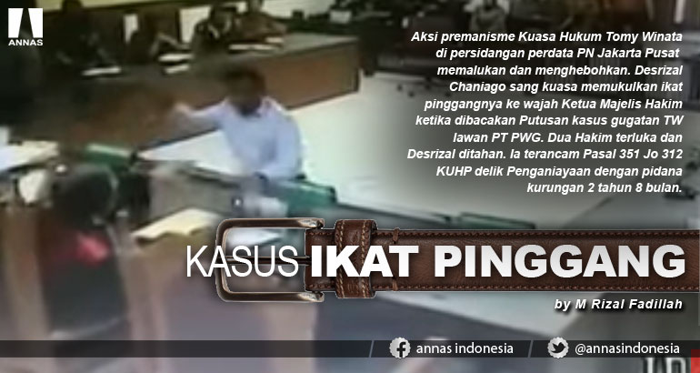 Masih banyak kemungkinan lain dari kasus "ikat pinggang" ini, akan tetapi peristiwanya telah memperburuk wajah hukum di Negara kita. Perlu evaluasi dan koreksi mendasar untuk membangun kepercayaan hukum kembali. Desrizal mesti diberi sanksi oleh asosiasi dan diproses hukum dengan tuntas. Tutup peluang intervensi yang merusak lebih parah dari tontonan yang memilukan ini.