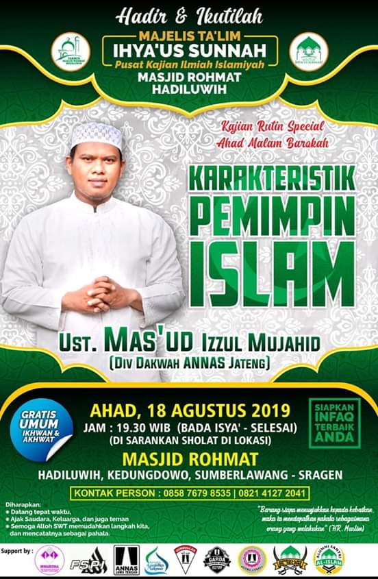 Roadshow dakwah pekan ini dengan tema: "Karakteristik Pemimpin Islam" bersama Narasumber: Ust. Mas'ud Izzul Mujahid.