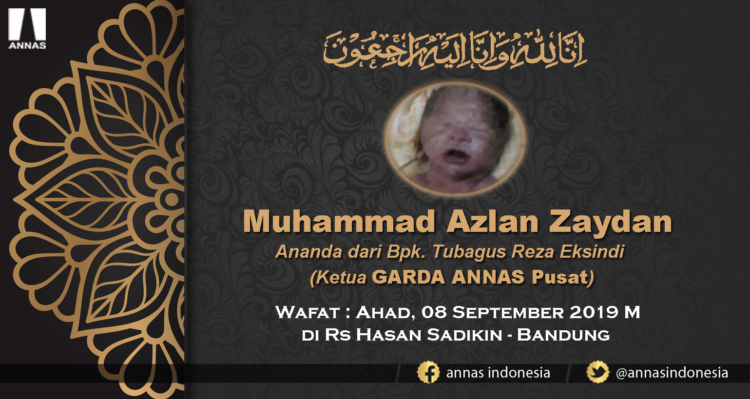 Keluarga Besar Aliansi Nasional Anti Syiah ( ANNAS ) Pusat, dengan ini ikut berduka cita atas wafatnya Ananda MUHAMMAD AZLAN ZAYDAN, Ananda dari Bpk. Tubagus Reza Eksindi (Ketua GARDA ANNAS Pusat) pada hari Ahad, 08 September 2019 di RS Hasan Sadikin - BANDUNG.