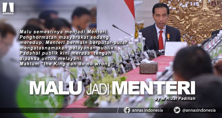 Malu semestinya menjadi Menteri. Penghormatan masyarakat sedang meredup. Menteri bermain berputar-putar mengatasnamakan pelayanan publik. Padahal publik kini merasa tengah dipaksa untuk melayani. Maklum "the King can do no wrong". Membentak, senyum, nyinyir, atau tertawa pun selalu benar. Buang angin menjadi penggalan kebenaran pula. Jokowi harus berbenah drastis agar rakyat percaya dan mendukung. Menteri Menteri jangan menjadi punakawan "tanpa reserve". Disuruh berbaju putih ikut semua berbaju putih. Karena itu adalah perilaku tidak mulya. Entah apakah sastrawan Taufik Ismail masih bersemangat untuk membuat puisi berjudul "Aku Malu Menjadi Menteri Jokowi".