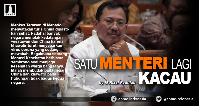 Waduh ini menteri gimana ya. Menkes Terawan di Menado menyatakan turis China dipastikan sehat. Padahal banyak negara menolak kedatangan wisatawan dari China karena khawatir turut menyebarkan virus corona yang sedang mewabah. Bagaimana seorang Menteri Kesehatan berbicara sembrono soal menjaga kesehatan warga bangsanya. Malah membudak pada negara China dan khawatir pada hubungan tidak bagus kedua negara.