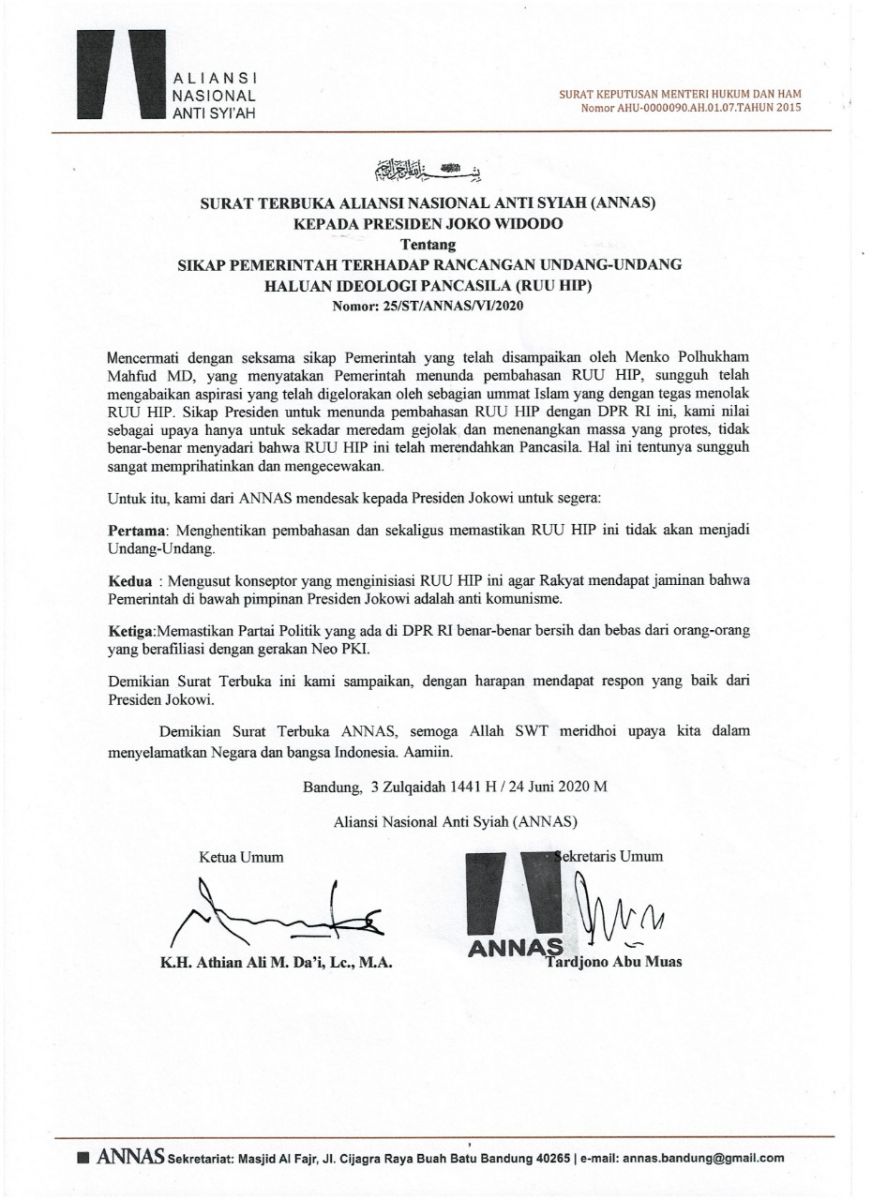 Pertama : Menghentikan pembahasan dan sekaligus memastikan RUU HIP ini tidak akan menjadi Undang-Undang.