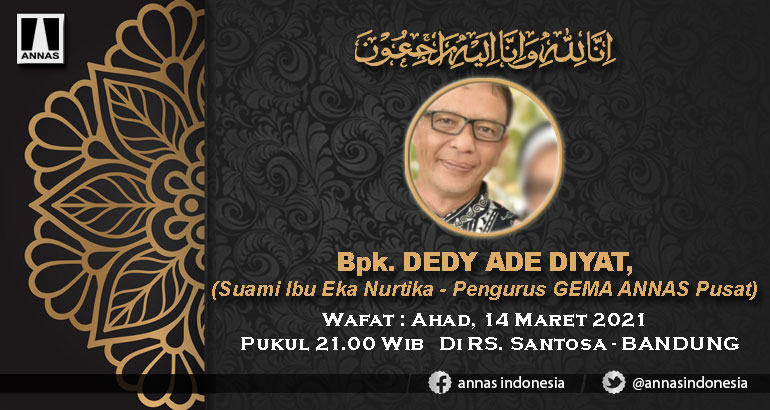 Keluarga Besar Aliansi Nasional Anti Syiah ( ANNAS ) Pusat, dengan ini turut berduka cita atas wafatnya Bpk. DEDY ADE DIYAT (Suami Ibu Eka Nurtika - Pengurus GEMA ANNAS Pusat), pada hari Ahad, 14 Maret 2021 , Pukul 21.00 WIB di RS. Santosa - BANDUNG.