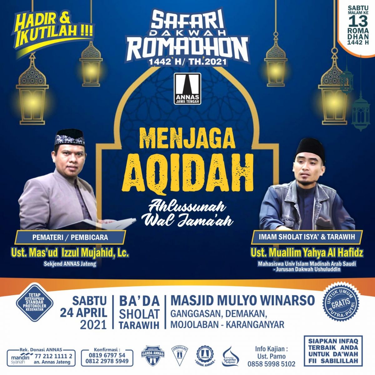 2. Masjid Mulyo Winarso, Ganggasan, Demakan, Mojolaban-Karanganyar Jateng. Narasumber: Ust. Mas'ud Izzul Mujahid, Lc., M.Ud. (Sekjen. ANNAS Jateng). Imam Shalat Isya dan Tarawih: Ust. Muallim Yahya Al Hafidz (Mahasiswa Univ. Islam Madinah Arab Saudi, Jurusan Dakwah Ushuluddin). Tema: "Menjaga Aqidah Ummat Islam"