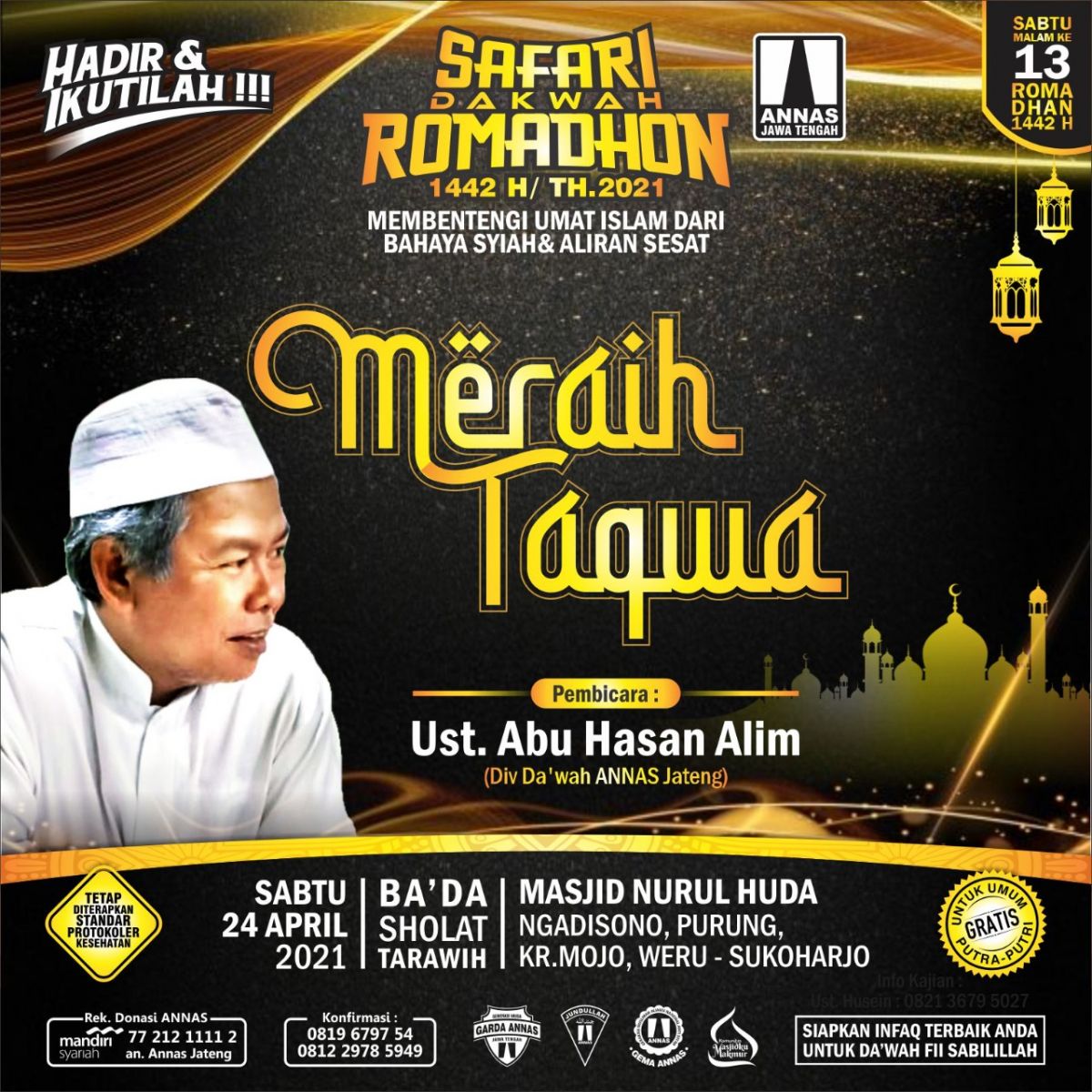 3. Masjid Nurul Huda, Ngadisono, Purung, KR. Mojo, Weru, Sukoharjo Jateng. Narasumber: Ust. Abu Hasan Alim (Div. Dakwah ANNAS Jateng). Tema: "Meraih Taqwa"