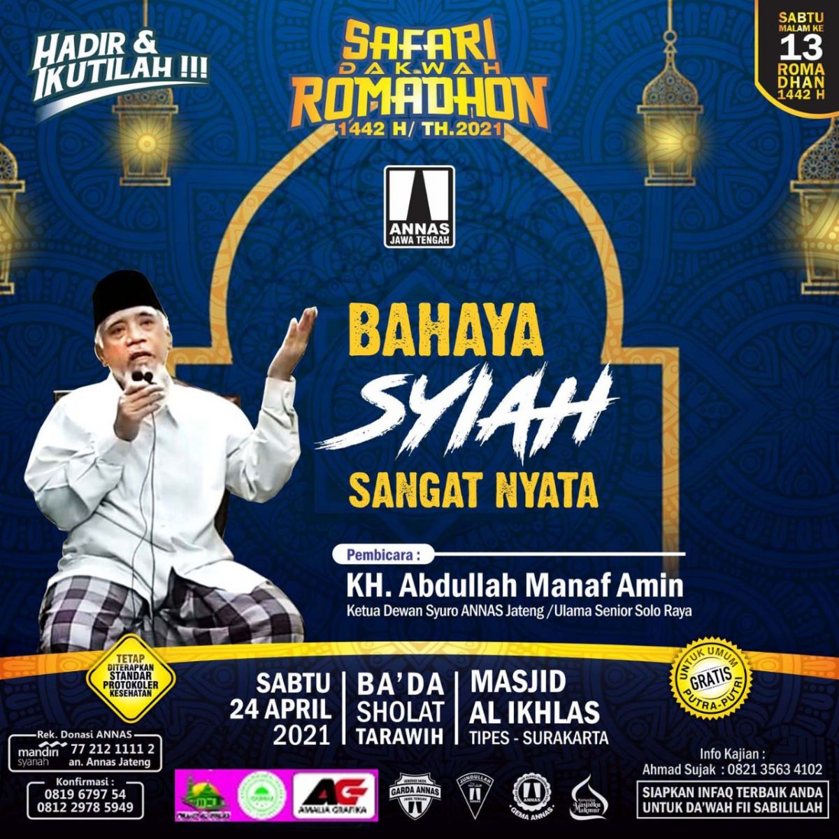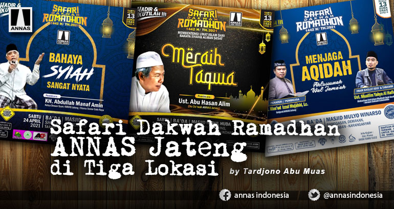 Solo. Gelaran Safari Dakwah Ramadhan 1442/2021 Aliansi Nasional Anti Syiah (ANNAS) Wilayah Jawa Tengah (Jateng) dengan mengusung tema utama: "Menjaga Aqidah Ummat Islam" untuk Sabtu malam giliran di Surakarta, Karanganyar, dan Sukoharjo Jateng.