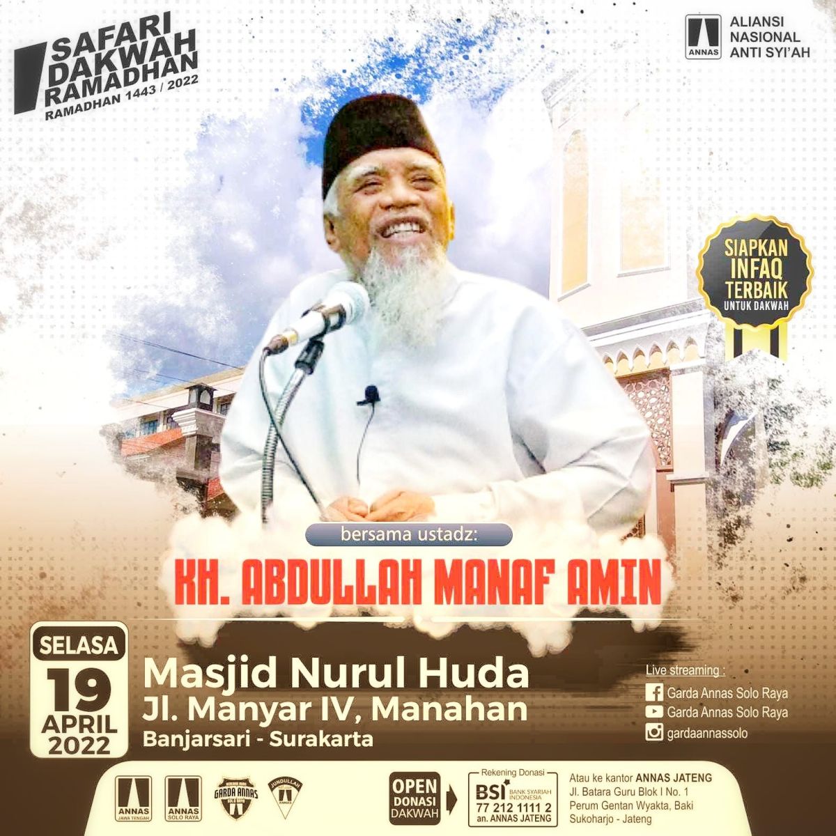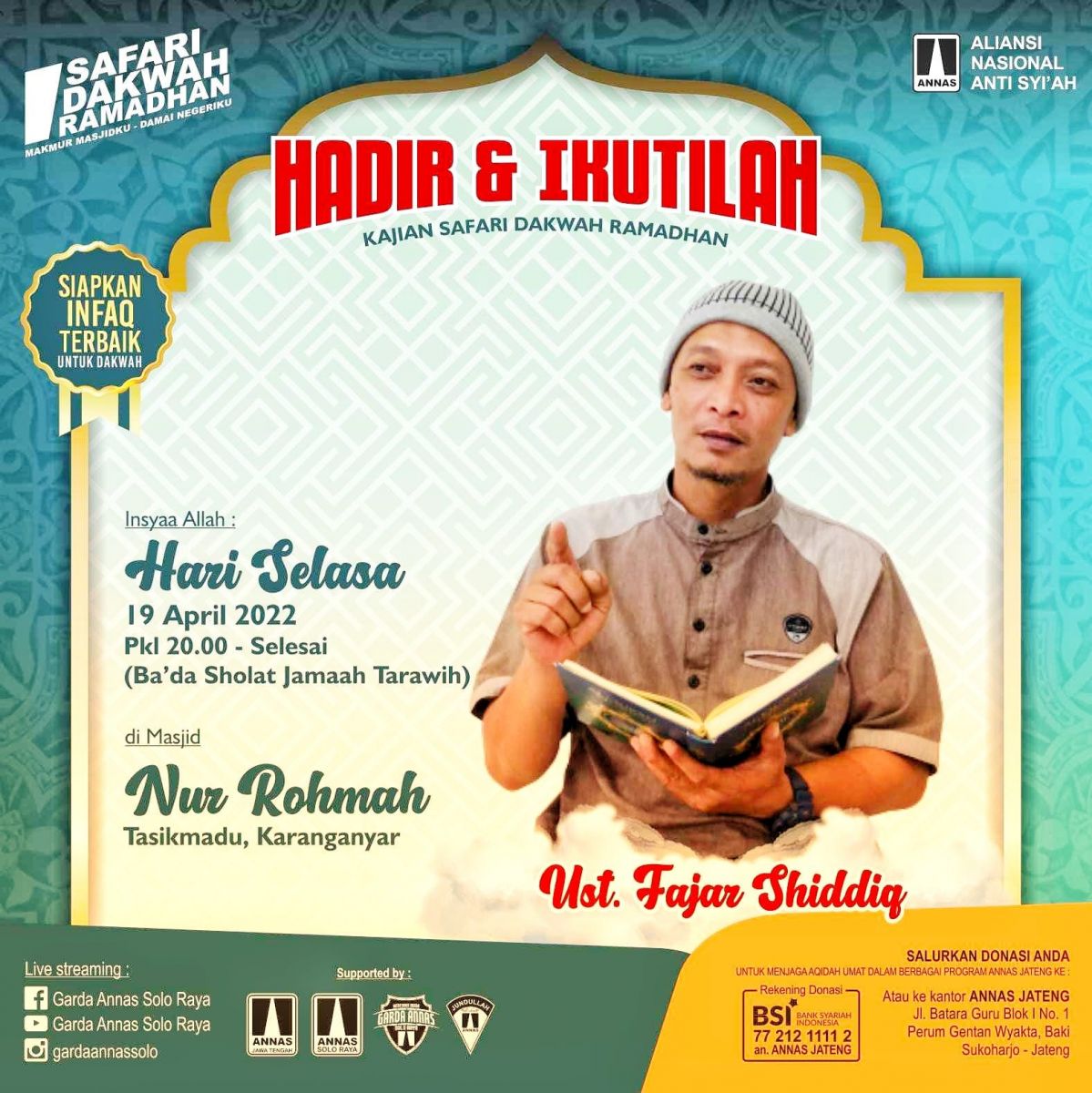 Solo. Aliansi Nasional Anti Syiah (ANNAS) Wilayah Jawa Tengah (Jateng) kembali menggelar program Safari Dakwah Ramadhan (SDR) 1443H/2022 sebagaimana gelaran SDR program tahun lalu.