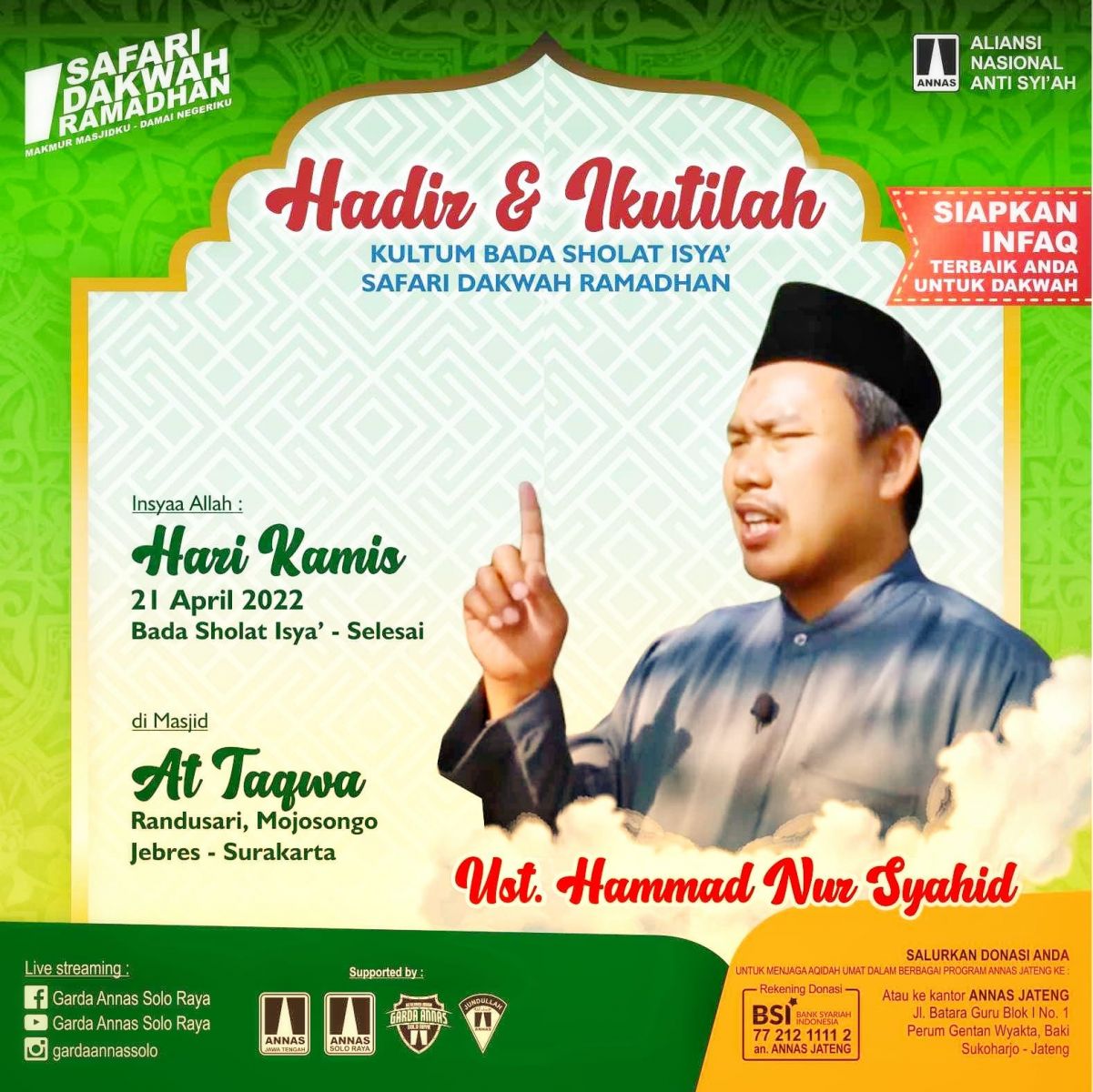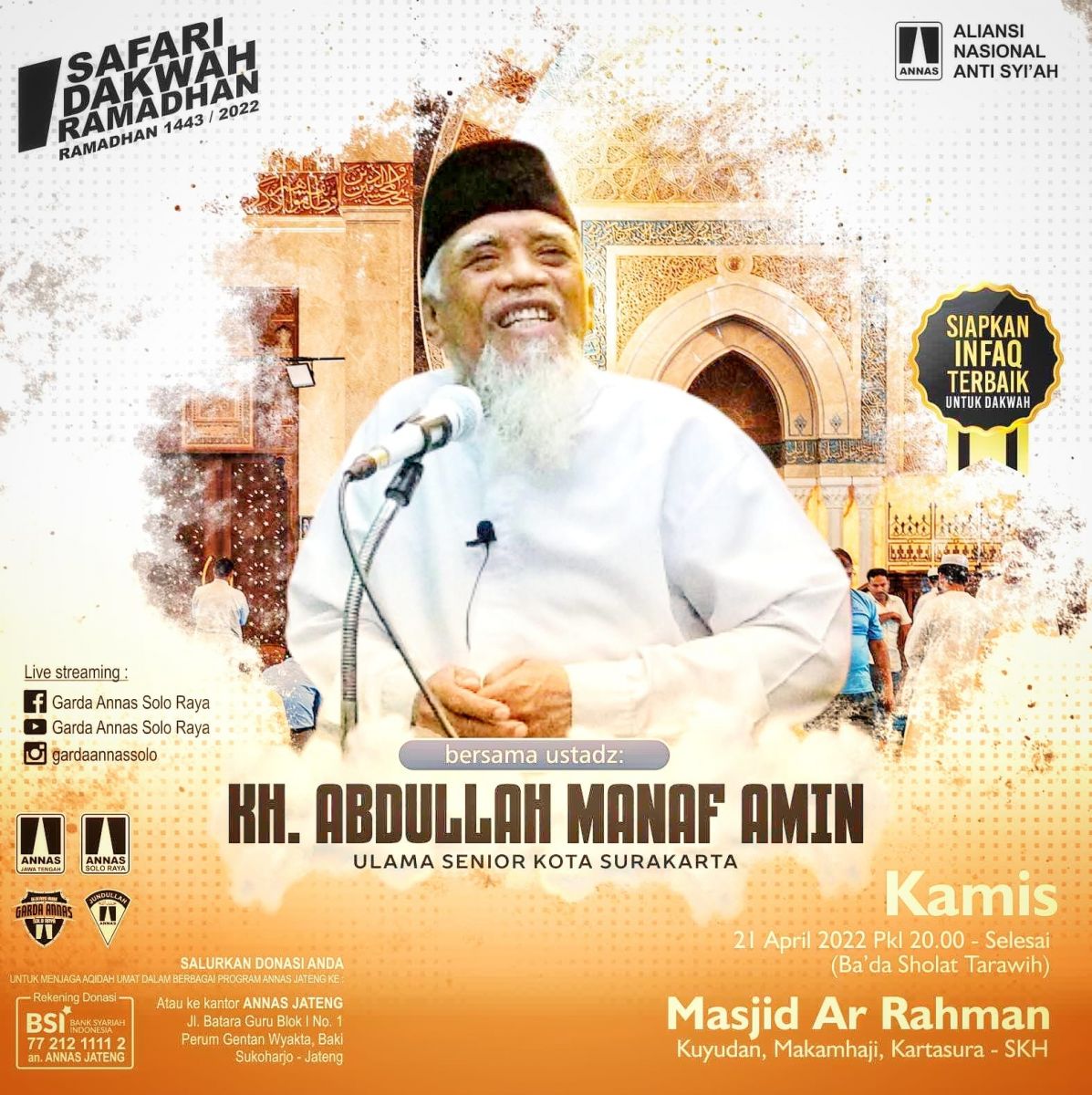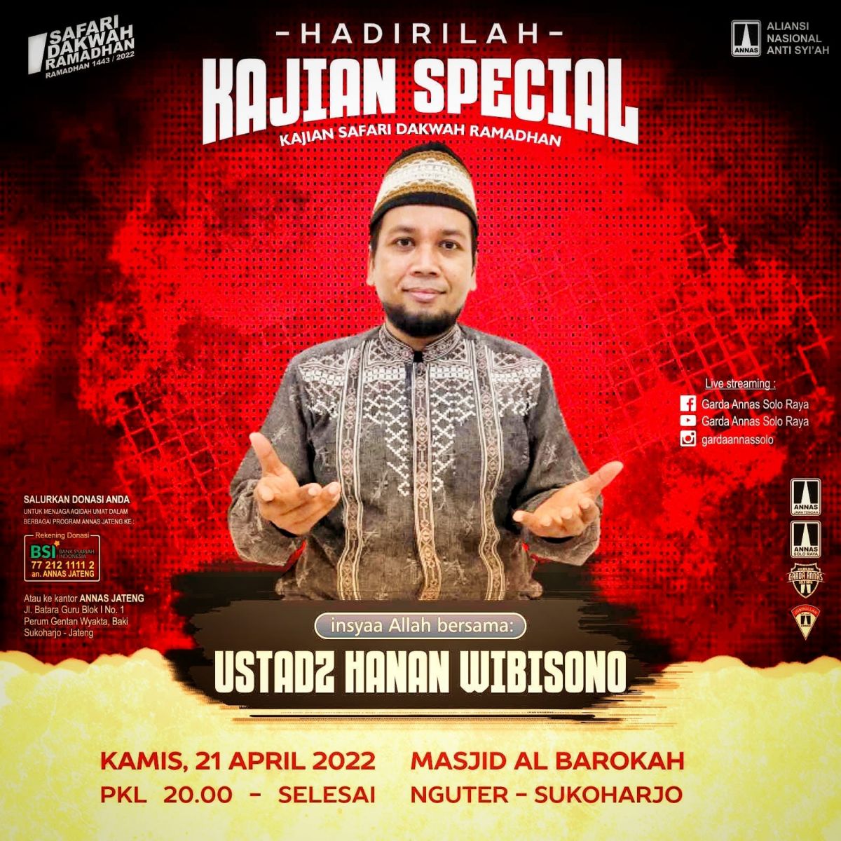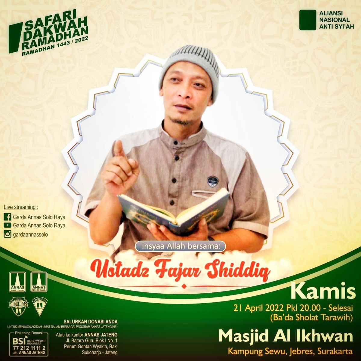 Solo. Aliansi Nasional Anti Syiah (ANNAS) Wilayah Jawa Tengah (Jateng) kembali menggelar program Safari Dakwah Ramadhan (SDR) 1443H/2022 sebagaimana gelaran SDR program tahun lalu.