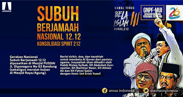 Gerakan Nasional Subuh Berjamaah 1212 dipusatkan di Masjid Pusdai Jalan Diponegoro No 63, Bandung, Jawa Barat. Kegiatan tersebut akan berisi zikir, doa, dan tausiyah.